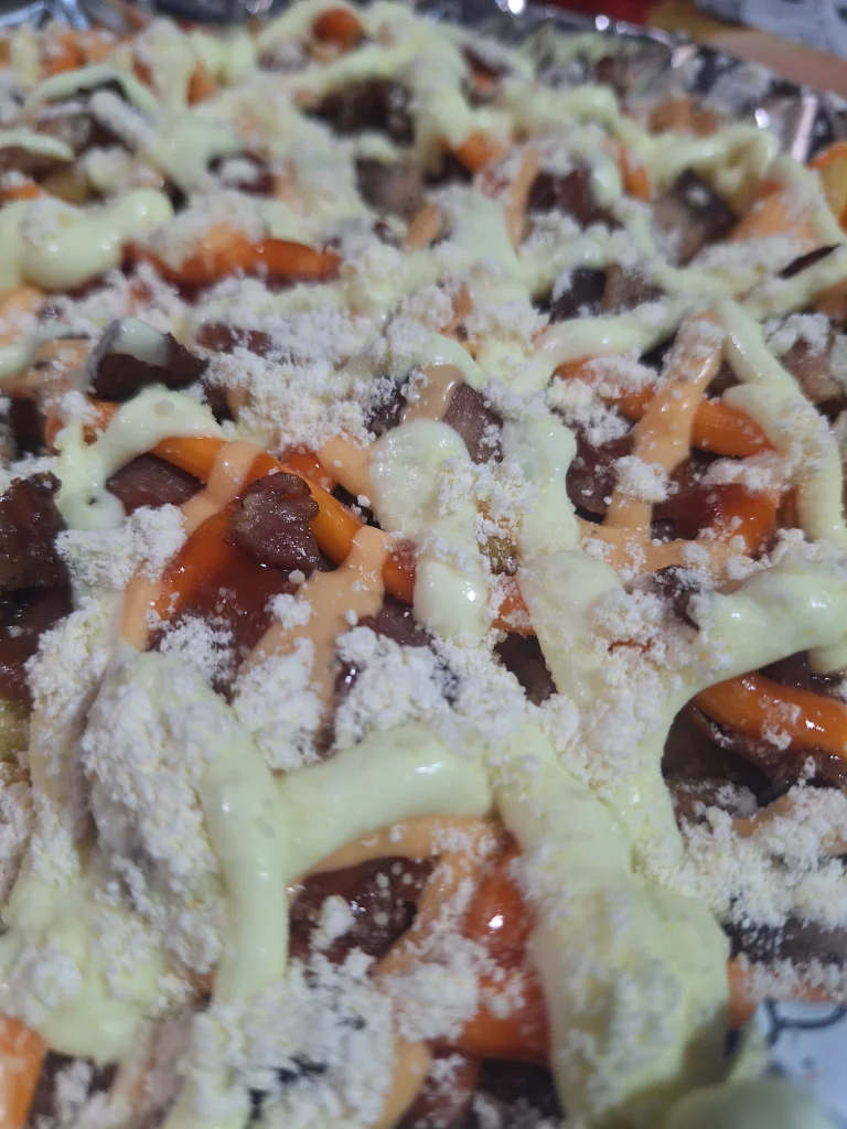 Batata fritas na embalagem de pizza 25cm , calabresa, bacon ,cheddar catupiry,...